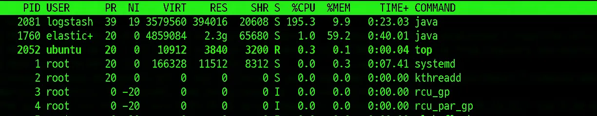 Logstash로 EC2에서 원격 DB(MySQL)로 데이터를 로드하고 Elasticsearch로 전달하는데 있어서 문제가 발생했습니다. 위 명령문을 실행했음에도 불구하고 EC2 자체가 응답없는 상태가 계속 진행되었고, 해당 문제를 파악하기 위해서 기본적으로 ELK Stack이 차지하는 CPU 및 RAM 점유율을 확인했습니다.