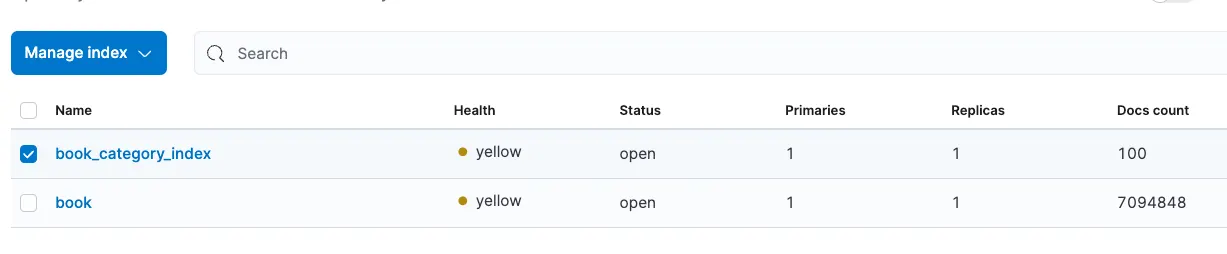 book_category라는 인덱스(테이블)이 생성되었고, 100개의 데이터를 정상적으로 가져왔습니다.