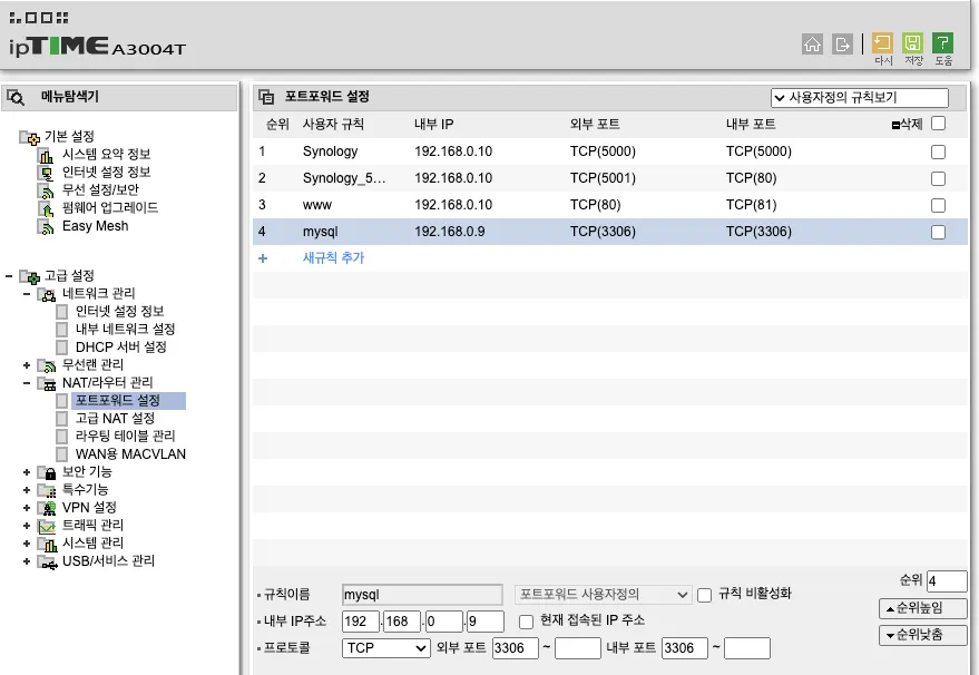이제 해당 로컬 컴퓨터(Mac)의 외부IP(인터넷과 연결된 실제 IP)로 MySQL에 접근 할 수 있을 줄 알았지만, 응답이 없는 문제가 발생했었습니다. 이는 외부 IP의 포트가 다른 내부 네트워크 설정의 타 프로젝트와 연결되어 충돌이 나타나는 부분이 있었고 mysql의 포트를 내부 포트와 외부포트를 연결하여 외부IP:3306으로 접근 가능하도록 포트포워딩을 진행했습니다.