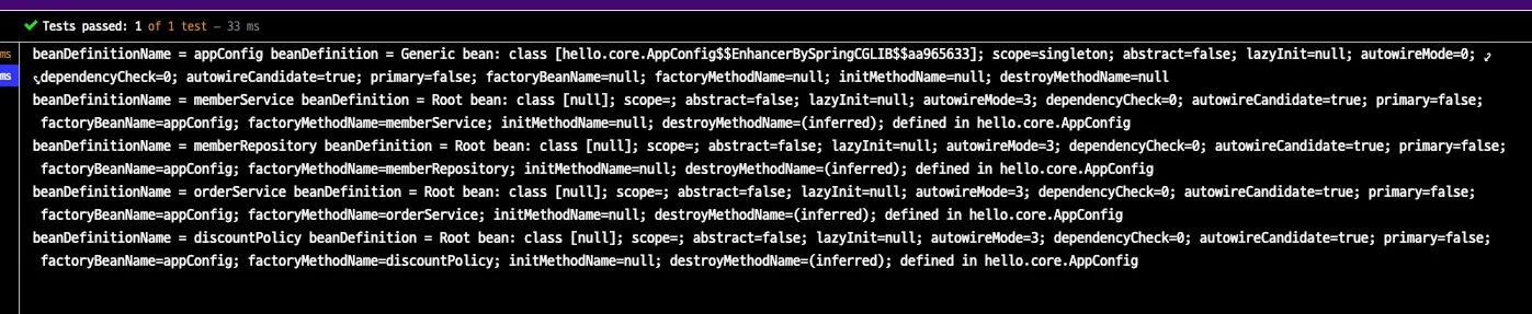 예로 AppConfig.class를 통해 자바 코드를 설정 정보로 사용한 경우 BeanDefinition 메타 정보를 조회하는 테스트 코드이다.