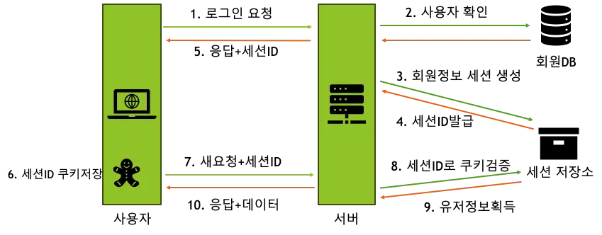 서버는 요청에 포함된 session-id 쿠키를 확인하고, 이를 세션 저장소에서 조회하여 해당 세션이 유효한지 확인