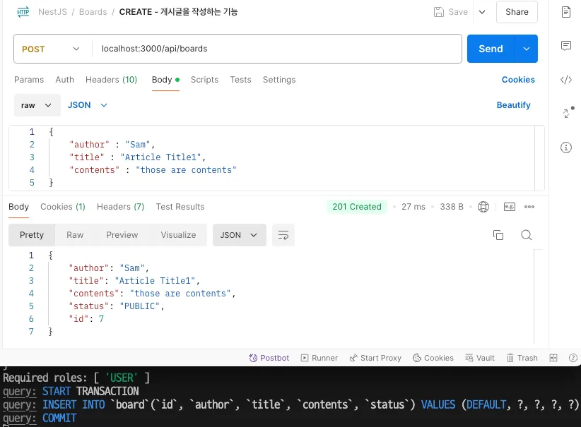 게시글 생성은 USER 권한만 접근 가능하다. (RolesGuard, @Roles(UserRole.USER))
