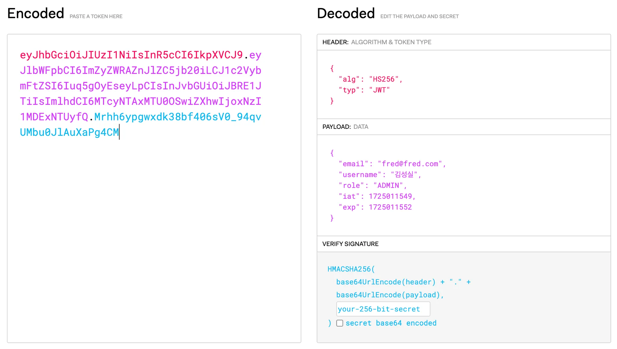 JWT 는 누구나 평문으로 복호화 가능하지만 Secret Key 가 없으면 JWT 수정 불가능
