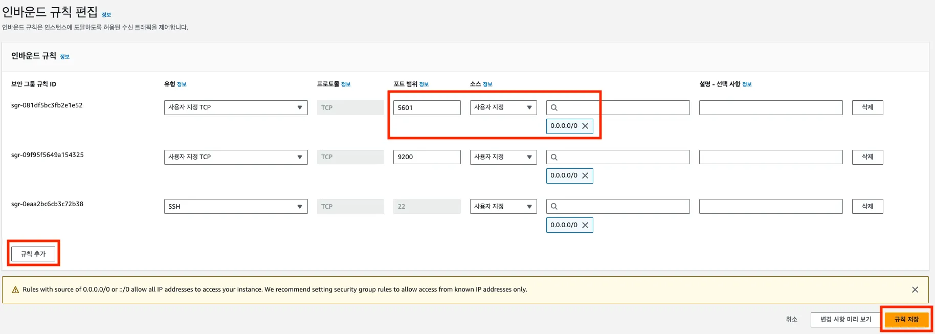 Kibana의 기본 포트는 5601포트 인바운드 규칙을 추가해주어야 합니다.