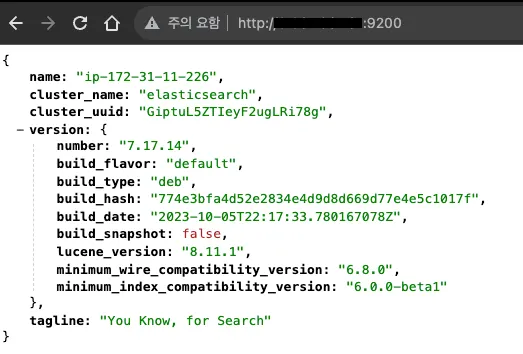 설정 적용 이후 브라우저 등을 통해 즉시 EC2의 외부IP(실제IP):9200 으로 Elasticsearch 서버에 접근 할 수 있습니다.