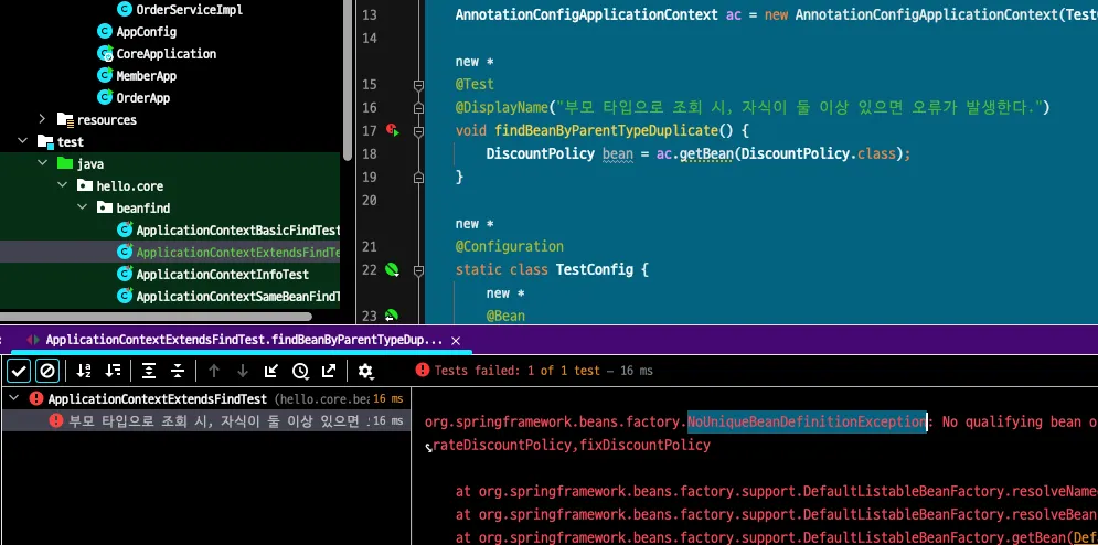 getBean()을 통해서 DiscountPolicy(부모 클래스)의 빈을 조회하면 구현체(자식)가 2개이므로 NoUniqueBeanDefinitionException 중복 예외가 발생하게 된다.