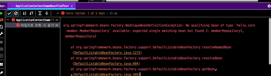 @DisplayName("타입으로 조회 시 같은 타입이 둘 이상 있으면, 중복 오류가 발생한다.")