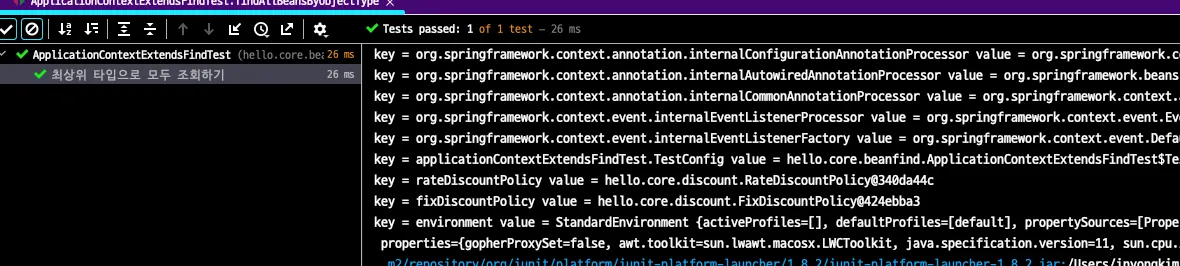 최상위 클래스인 Object로 조회하면 스프링 프레임워크에 등록된 빈들도 모두 조회 할 수도 있다.