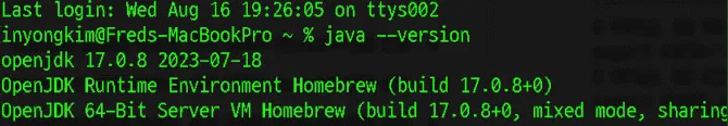 터미널을 모두 종료하고 다시 java —version 을 입력했다. 어? 11버전으로 바뀌었다.