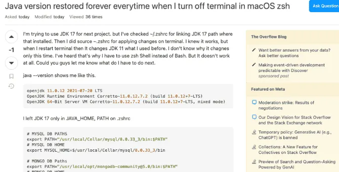 ChatGPT와 이것때문에 하루 종일 찾았다. 결국엔 어떤 환경 변수 설정이 계속해서 17을 11로 덮어서 적용시키고 있는 문제로 요약했다. 그 원인을 찾아야 한다. 계속해서 컴퓨터에 여러 JDK를 설치했엇고 지웠고를 반복하기도했었고, 어떤것은 인터넷에서 dmg를 받거나, 어떤것은 Homebrew로 받거나 해서 정리가 안되서 그럴수도 있었다.