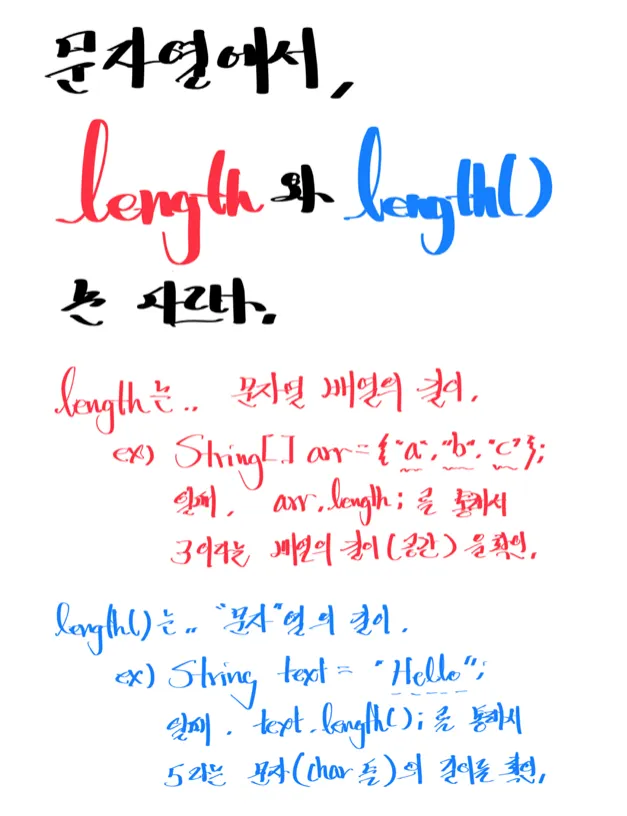 length는 문자열로 이루어진 배열 strArr[] = {’hi’, ‘hello’, ‘bye’} 에 몇개의 문자열이 있는지 정보가 필요 할 때 사용된다. 참고로 strArr[0]이 “hi”인지 확인하려면 ==연산자가 아니라, equals와 같이 접근해야 한다.