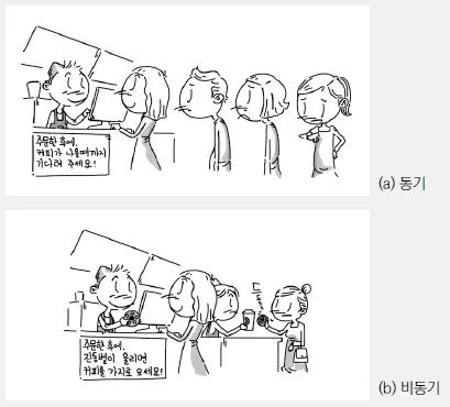 카페에 가서 커피를 주문한다고 가정하면, 동기식으로 주문하면 주문을 한 다음에 커피가 완성될 때까지 기다려야 한다. 다른 손님이 주문한 커피가 완성되기 전에는 새로운 주문은 처리되지 않는다.