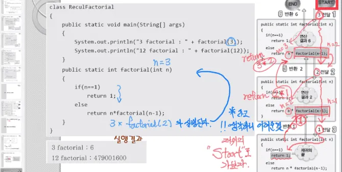 그 메소드(2)를 호출 했었던 가장 처음 메소드(1)은 return n*factorial(n-1)이란 부분에서 n은 최초 메인으로부터 전달되었던 3* 메소드(2)의 반환값인 2가 반환되어 결과로 출력되는데, 3*2로 6이 나오게 된다.
