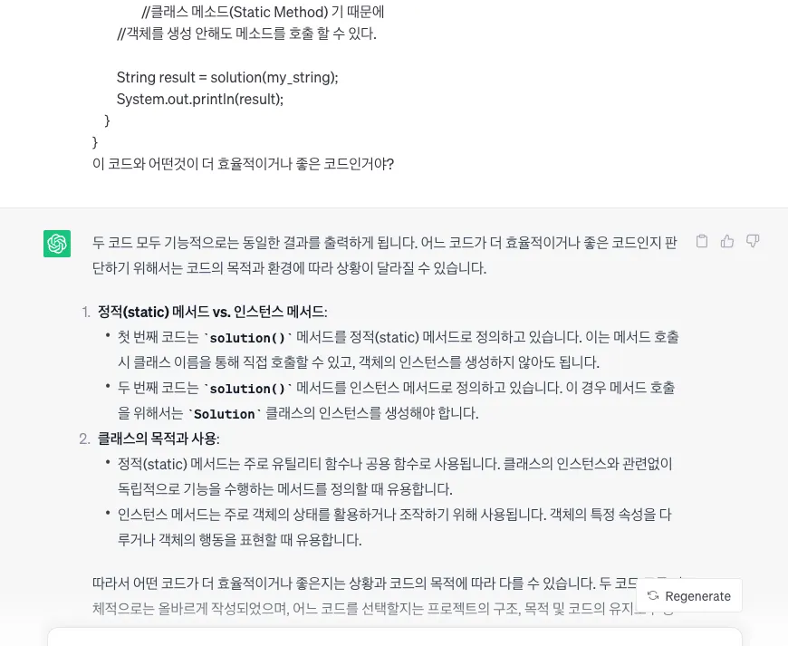 하지만 여기서 또 의문이 생겼던 것은 static(정적) 메소드 로 표현해야 되는가? 라는 의문이었다. 계속해서 Main.java와 Solution.java파일을 분리해서 객체를 생성하고 객체로부터 메소드를 불러왔기 때문에 한파일에서 작업하는 것이 낯설었는데 두개를 비교해보니 어떤 것이 효율적인것인지 올바른?(좋은)코드인지 구분이 안됐다. 물론 단순한 기능이기 때문에 크게 상관 없을 수도 있지만, 근본적으로 인스턴스(객체) 메소드, 정적 메소드 둘 중 어떤 쪽으로 사용해야되는지에 대한 궁금증이다.