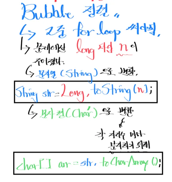 우선 처음 주어진 값이 long이었기 때문에 → 문자열로 변환 → 문자 배열 타입으로 변환을 거쳐서 버블정렬에 들어가야 한다.