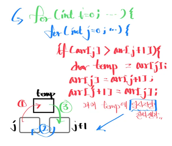 temp를 만들어서 넣고 교대로 넣는것, 이전에 배웠었고 확실히 기억하는데 버블정렬이었던것이 기억안났었다. 아하 이거였구나 했다.