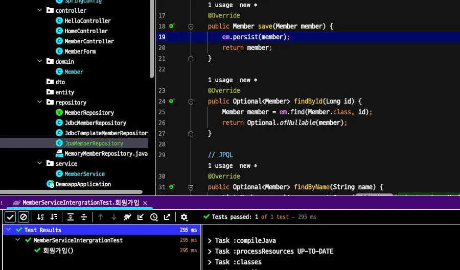JpaMemberRepository.java 라는 구현체를 작성해본다. EntityManager를 통해 CRUD Operation을 실행하게 된다. JDBC 템플릿 코드보다 상당히 많은량을 줄일 수 있으며 특히 특별한 쿼리문 없이 관리되는 것을 볼 수 있다.