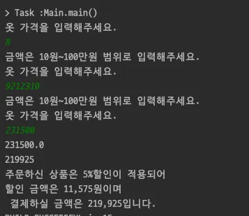 옷가게 포스기에서 볼법한 프로그램이다. 가격별로 할인이 적용되도록 구성해야 하는데, 처음에 input부분에서 모두 해결하려고 하니 복잡해서 다시한번 연산 메서드calculator(){}로 넘겨서 좀 더 편하게 작업 할 수 있었다. 단순히 출력하는 것보다 실제로 마트같은데서 사용하는 포스기가 이런 방식의 프로그램이 들어간건가 궁금하긴 하다.
