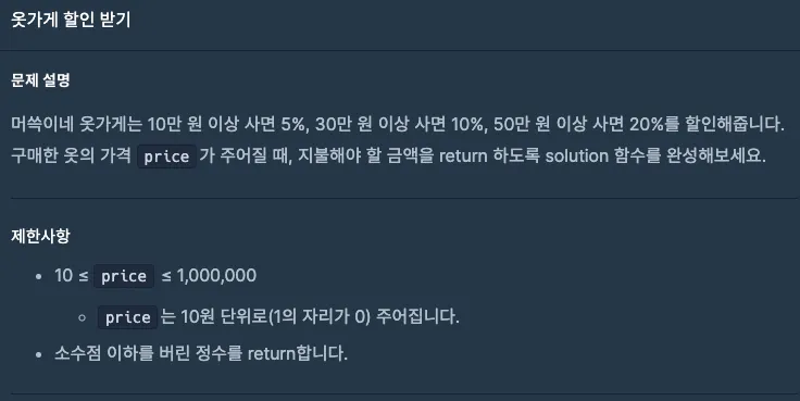//구매한 옷의 가격 price가 주어질 때, 지불해야 할 금액을 return 하도록 solution 함수를 완성해보세요.