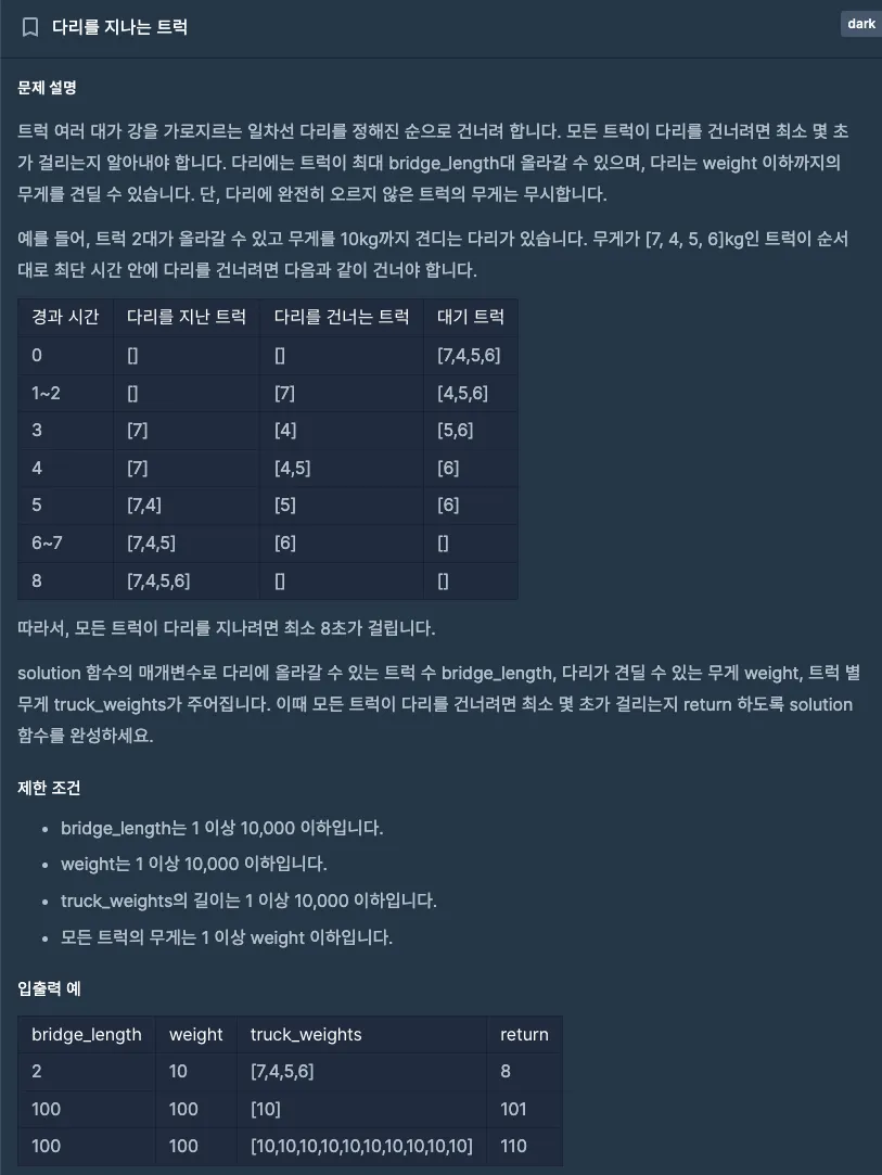 우선 직관적으로 다리에 차들이 일렬로 지나가는 모습이 그려지면서 FIFO(First In First Out)의 자료구조가 필요하다고 판단되었다.