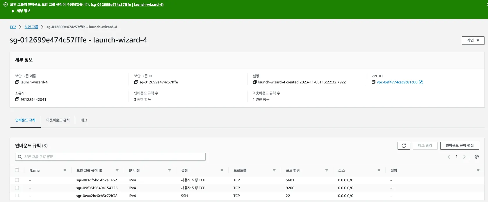 Kibana의 기본 포트는 5601포트 인바운드 규칙을 추가해주어야 합니다.