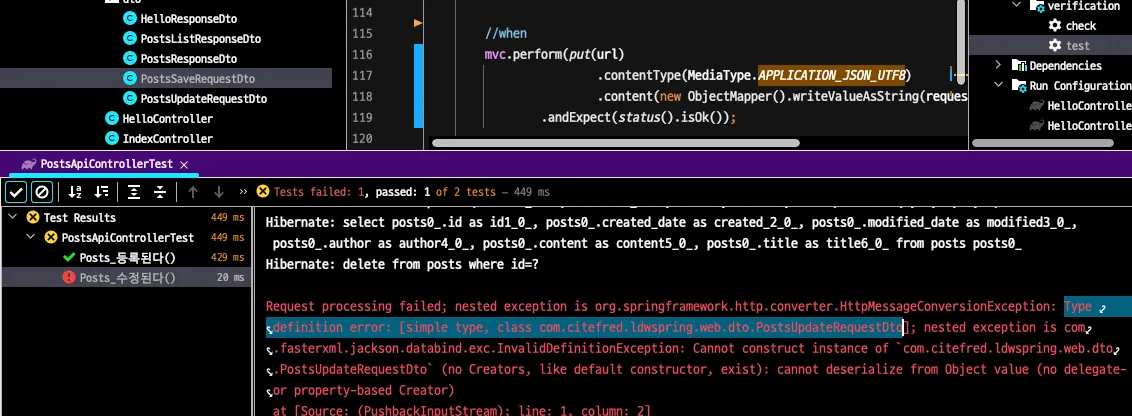 따라서 PostsUpdateRequestDto 를 열어본 결과 @Getter 어노테이션 외에 별다른 설정은 없었고, 그럼 정상 작동하는 PostsSaveRequestDto는 어떻게 차이나는지 열어본 결과 @NoArgsConstructor 으로 기본 생성자를 작성해주고 있는 차이가 있었다.