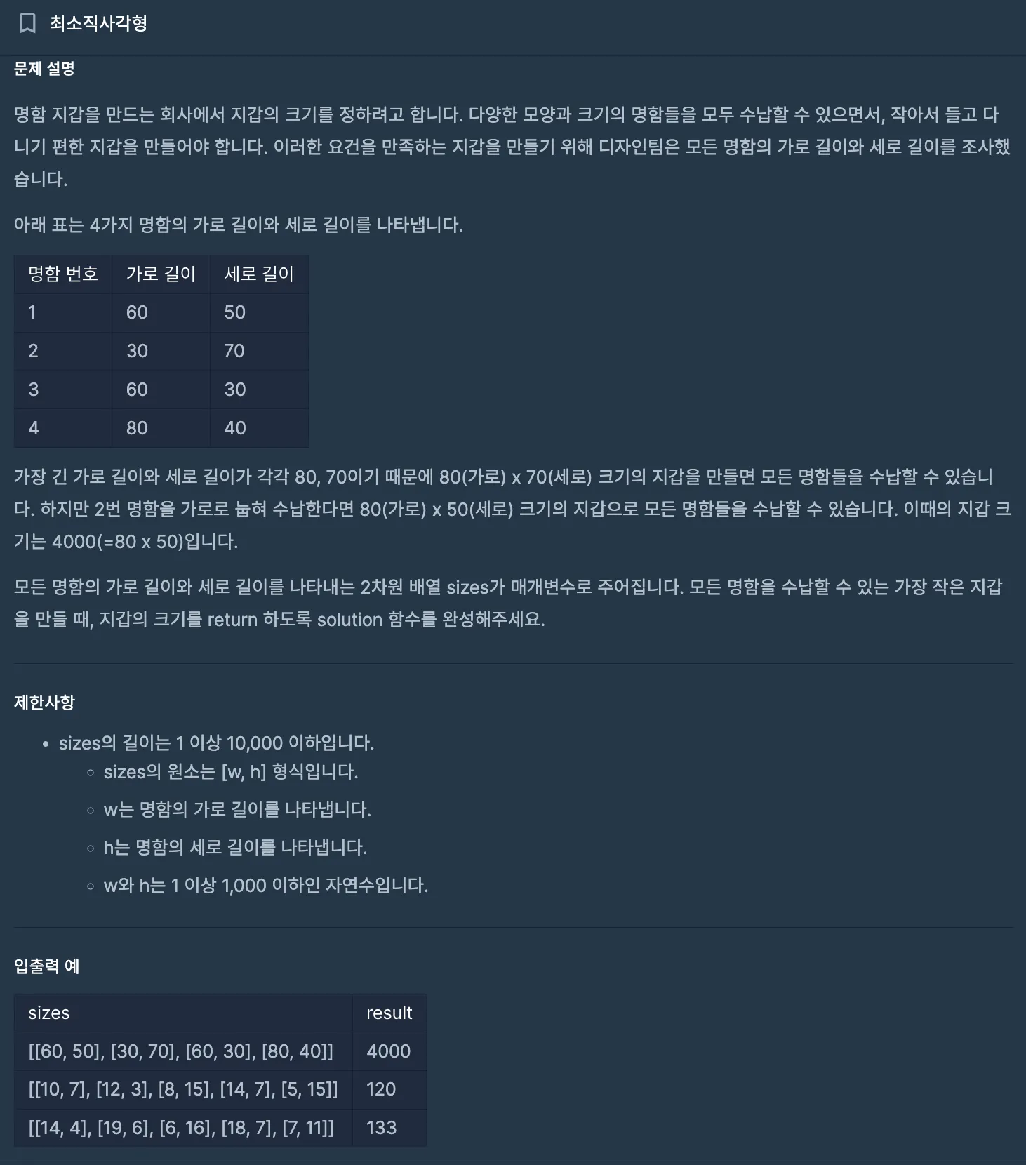 maxHeight = Math.max(maxHeight, Math.min(sizes[i][0], sizes[i][1])); // [i][0]과 [0][i]를 모든 요소를 돌면서 배열중 작은값을 추출하고, 그중 가장 큰 값을 뽑아내게된다.