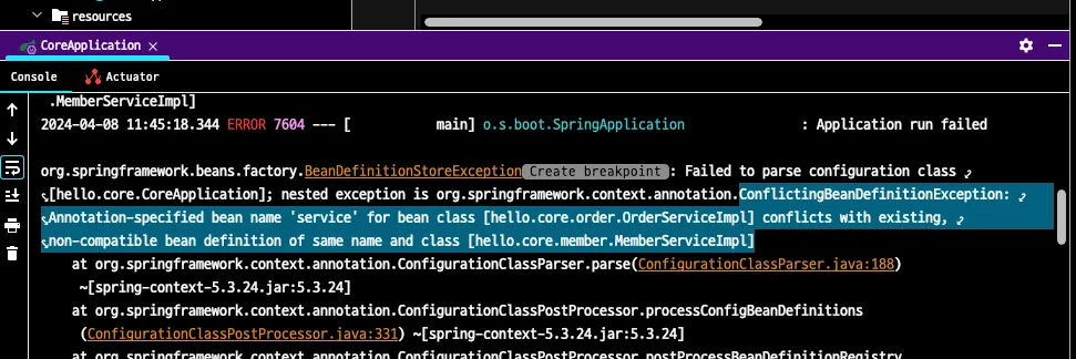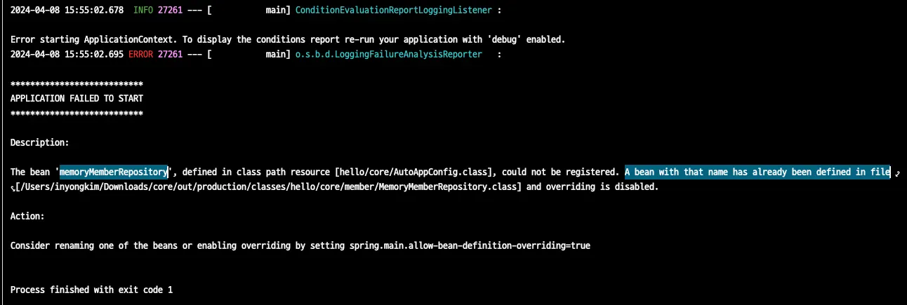 이처럼 동일한 이름의 빈이 중복되었다는 메시지가 나타난다.