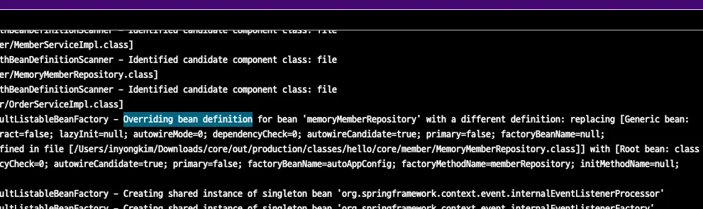 위 처럼 수동 빈 등록이 자동 빈 등록을 오버라이드 하는 상황은 의도한 결과지만 수많은 코드에서 의도하지 않은 오버라이드로 자동 빈 등록 객체를 잃어버린다면 찾아내기 어려운 상황이 발생할 수 있다. 이러면 코드상에서 오류를 발생시키지 않기 때문에 매우 찾기 어려운 버그로 발전할 가능성이 있다.