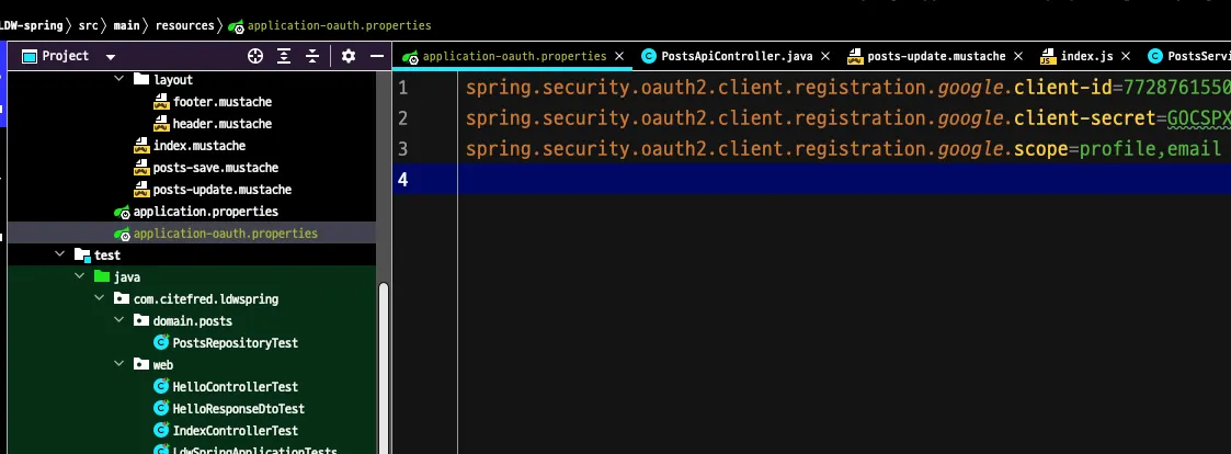 스프링 부트의 기본 설정 파일인 application.properties 에서 application-oauth.properties 를 포함하도록 코드를 추가