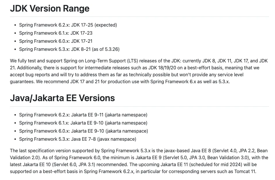 그것은 서로 호환되는 버전의 차이가 주요 내용이었다. 결과적으로 프레임워크가 최신버전일수록 JDK17 버전을 필요로 하는 것이 보여졌다.
