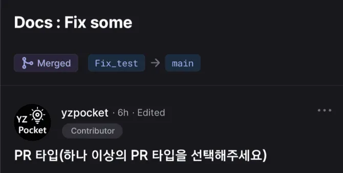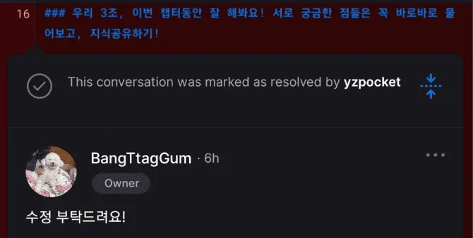 PR작성자는 충돌부분 해결 및 완료 PR 재전송