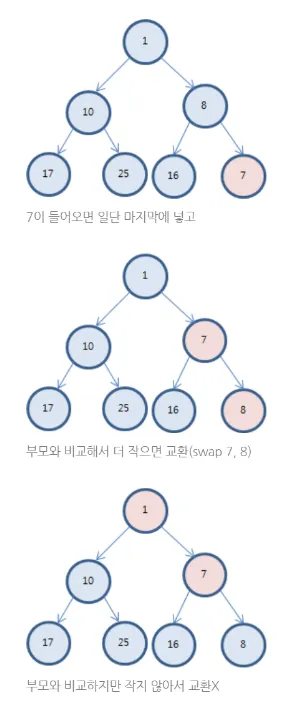 하지만, 우선순위 큐에 값을 추가한다면 아래 그림과 같은 과정을 통해 즉시 정렬이 됩니다.