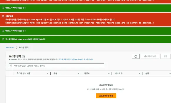 이 부분에서 가이드를 잘못 따라가면서 문제가 있었을 지도 모른다. 다시 호스팅영역을 삭제하고 새로 생성해보려고한다.