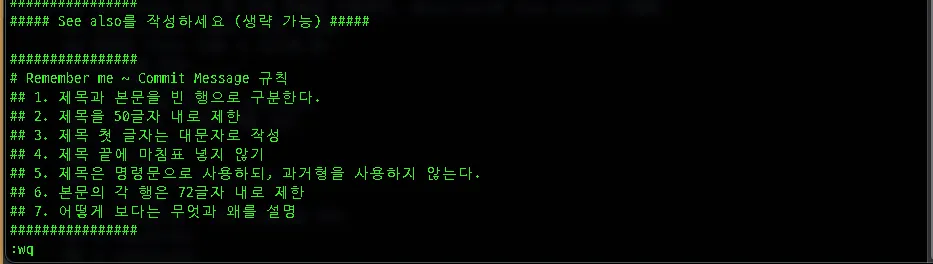 즉시 VI 에디터로 설정한 template이 열리는 것을 확인할 수 있다. 작성해 둔 주석 가이드에 따라 지정된 라인에 커밋 메시지를 입력한다.