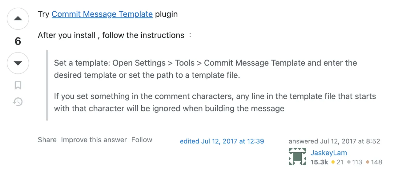 두 번째 답변은 IntelliJ의 마켓플레이스에서 Git Commit Template라는 플러그인을 추천한다는 답변을 보았다.