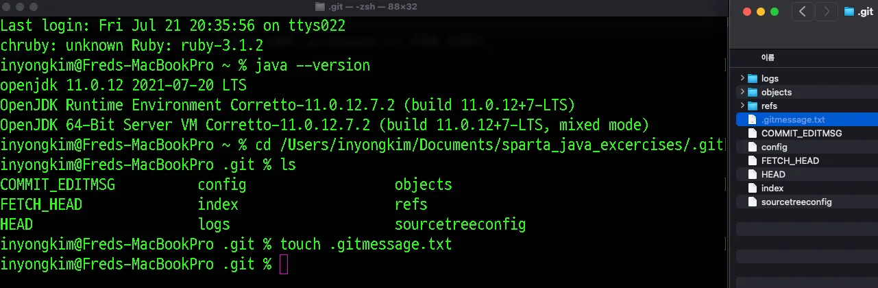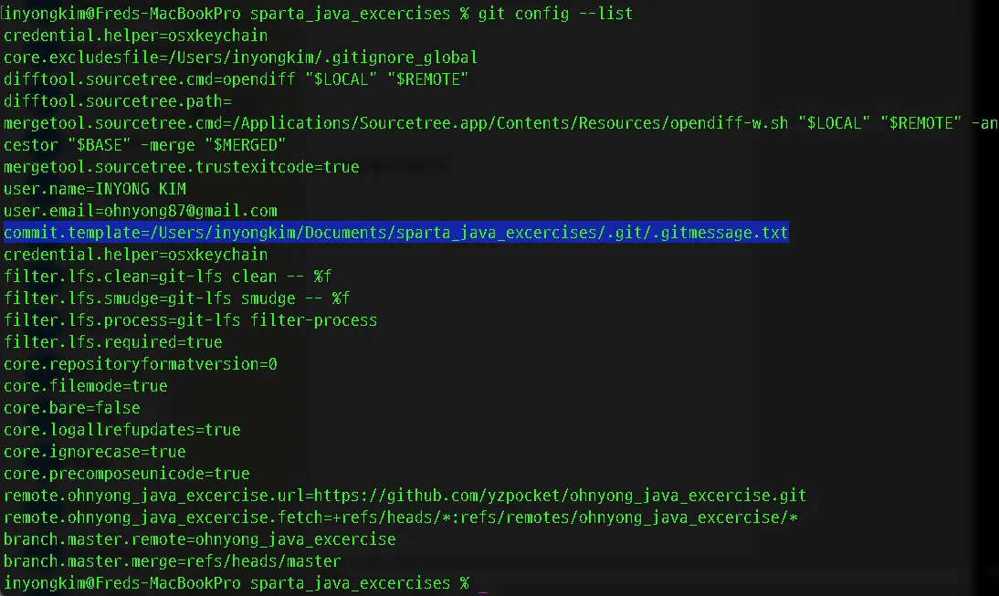 아래와 같이 template로 설정한 파일이 commit.template에 경로가 등록되었다.