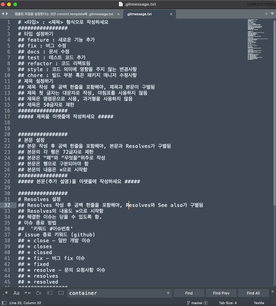 commit.template에 .gitmessage.txt 파일을 등록한다는 의미