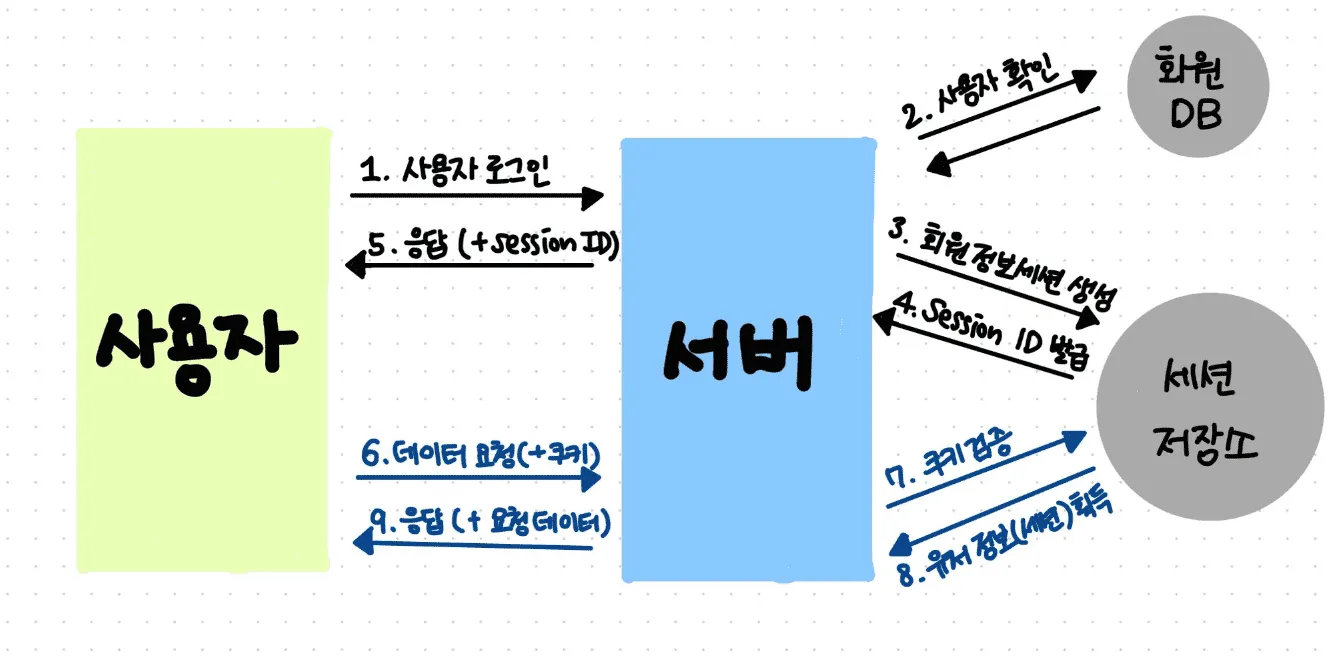 클라이언트는 그 session-id를 쿠키라는 저장소에 보관하고 앞으로의 요청마다 session-id를 같이 전송 (주로 HTTP header에 담아서 보냅니다!)