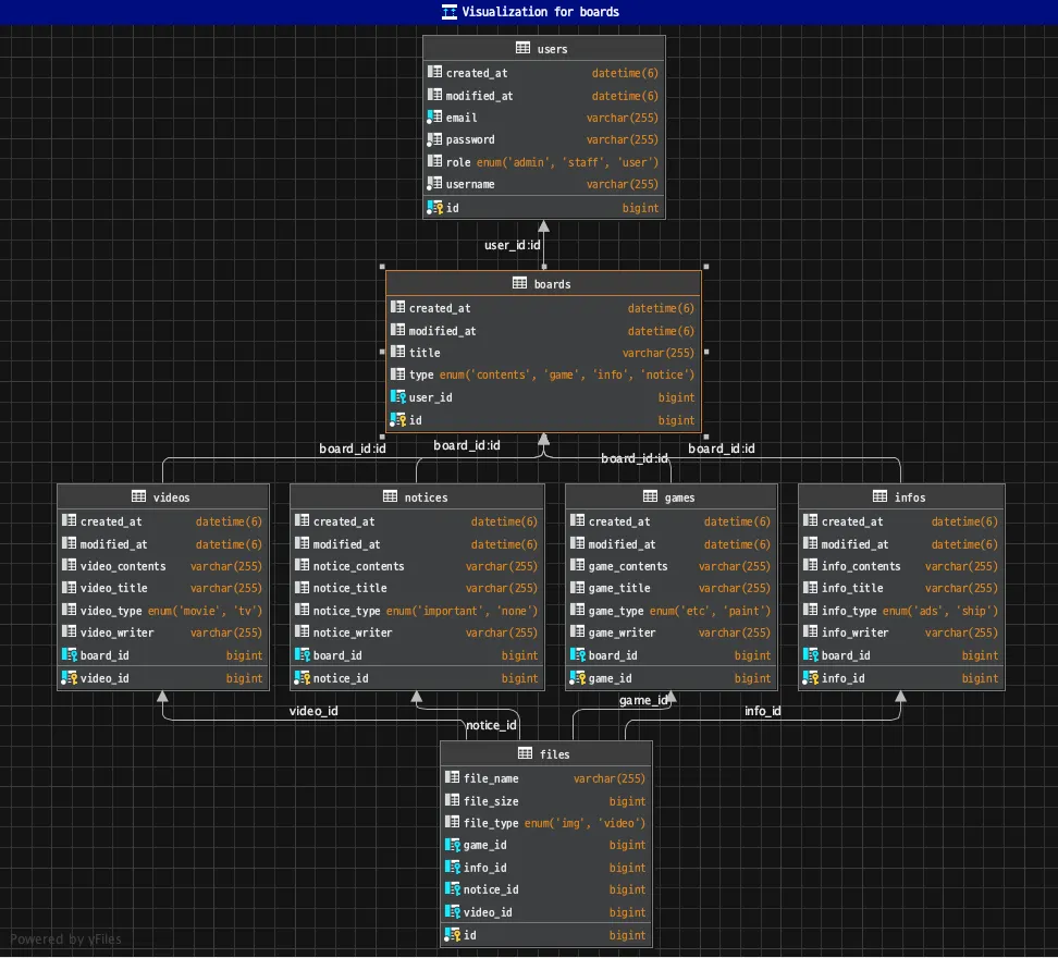 모든 콘텐츠는 사실 게시글이라 볼 수 있다. 그 컬럼의 내용이 달라지거나 위치만 달라질 뿐, 파일이 있는것 없는것 추후에 추가가 필요할것을 고려하여 파일 테이블을 별도로 분리하고 연관관계로 처리했다.