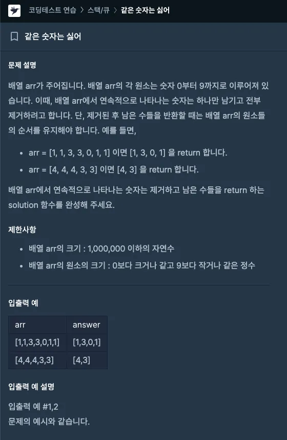 배열의 요소들을 스택 객체에 복사하는 시점에, 중복값이 있는 경우 continue를 통해 다음 요소로 넘어가도록 설정했다.