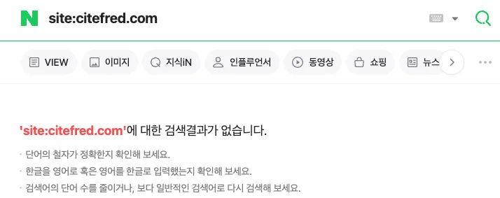 NAVER 검색창에 site:{URL}을 입력하면 내 웹사이트를 수집하고 있는지 확인할 수 있다. 네이버 검색을 통해서 내 웹페이지가 나타나지 않고 있음을 인지했다.