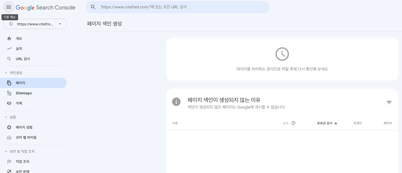 방금 사이트를 연결했기 때문에 데이터 처리중으로 나타난다. 몇일 후 어떤 방식으로 인덱싱되고 문제가 있는지 살펴볼 필요가 있다.