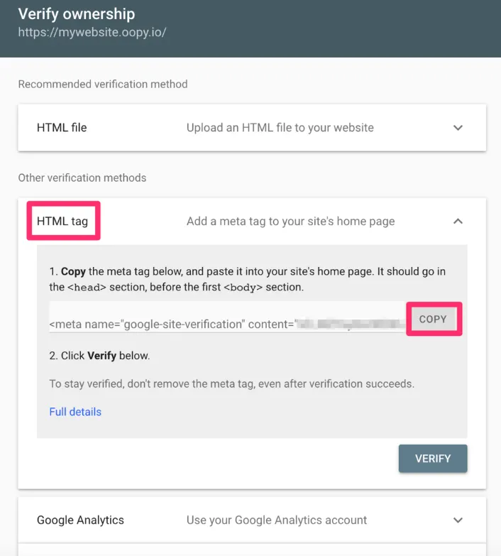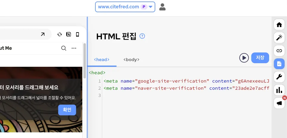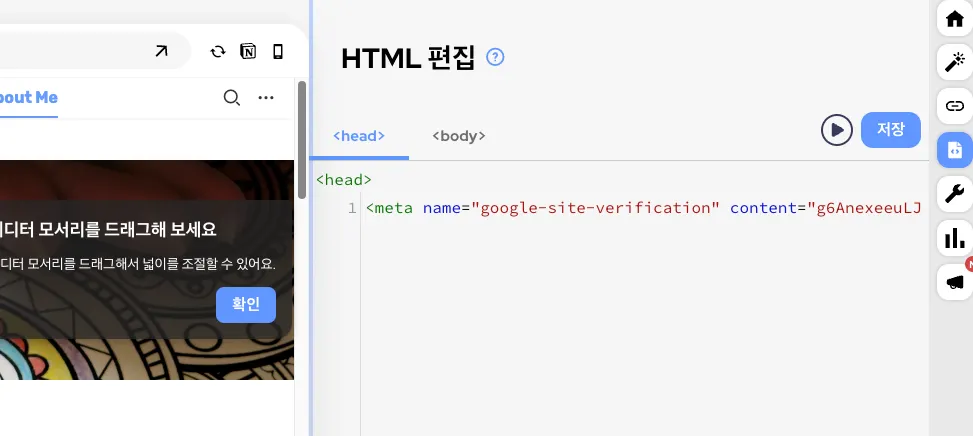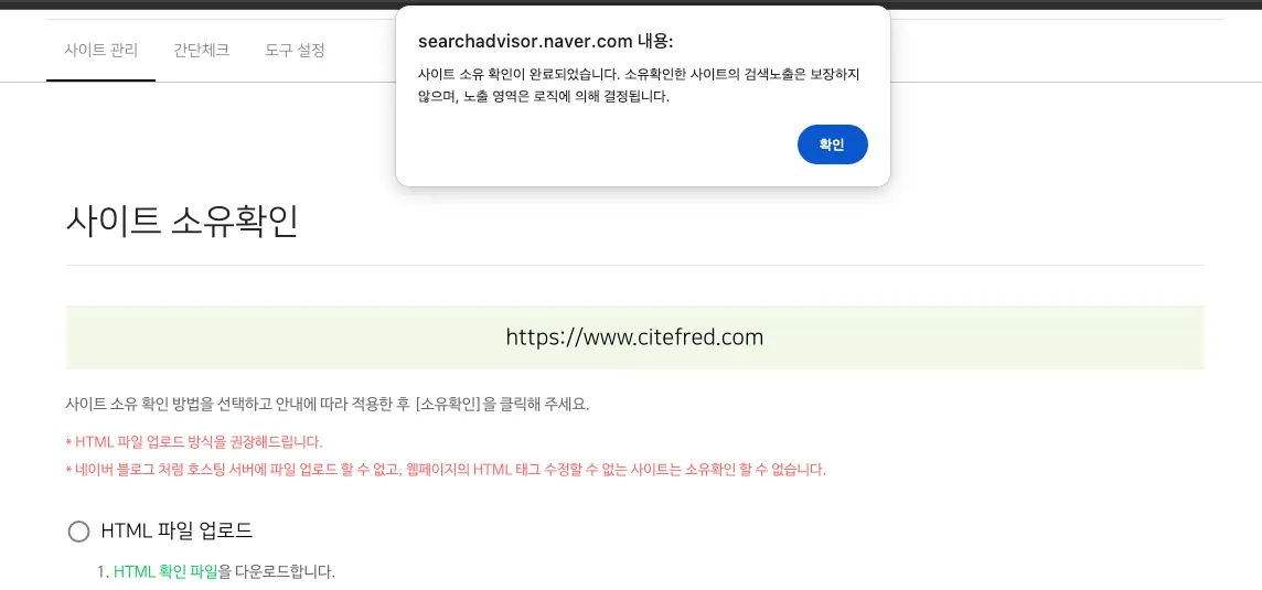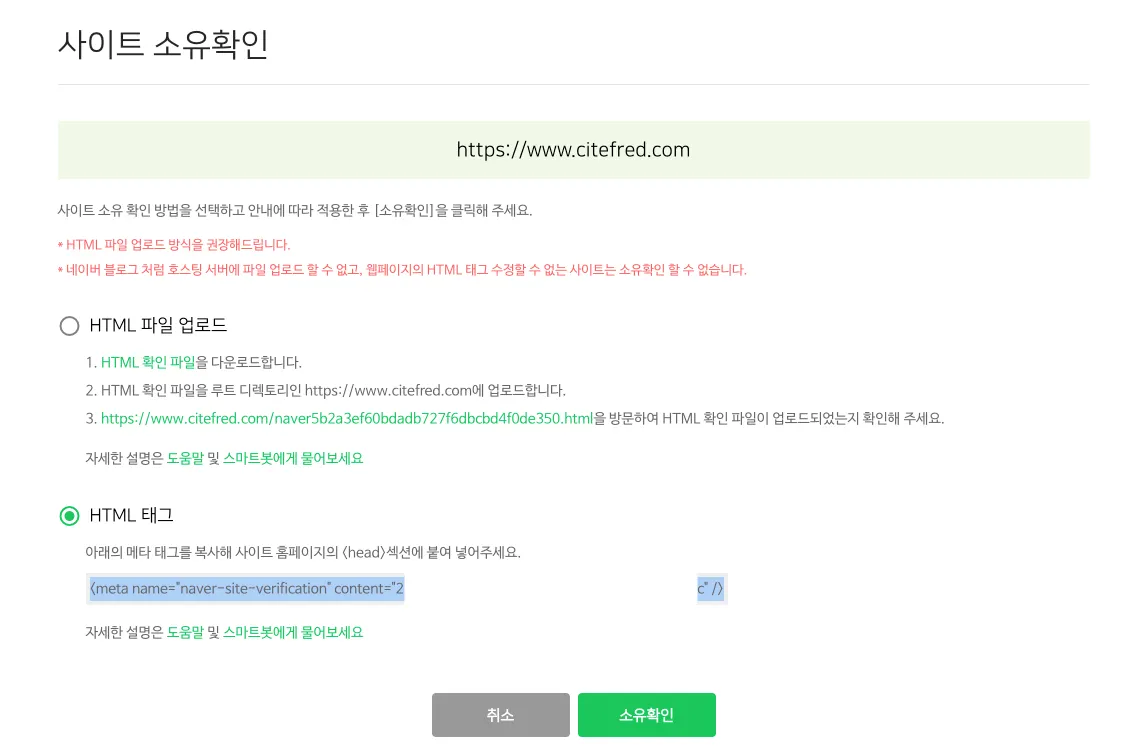 Google과 마찬가지로 해당 도메인에 대한 소유권을 확인하는 과정이 있다. 동일하게 HTML 태그삽입으로 인증하고자 한다.