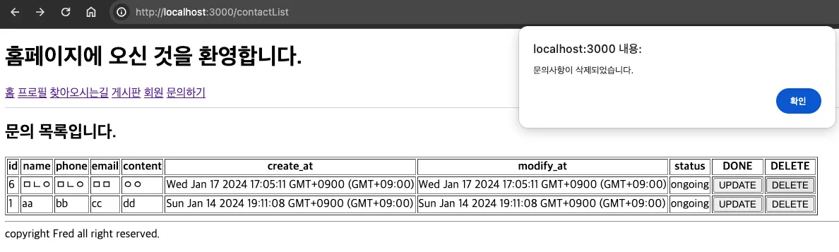 res.send("<script>alert('문의사항이 삭제되었습니다.'); location.href='/contactList'</script>");