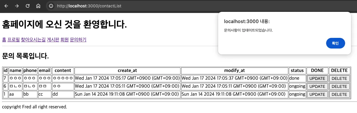 res.send("<script>alert('문의사항이 업데이트되었습니다.'); location.href='/contactList'</script>");
