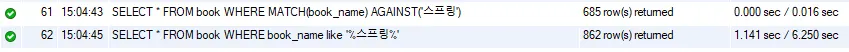 SELECT count(*) FROM book WHERE MATCH(book_name) AGAINST('스프링');