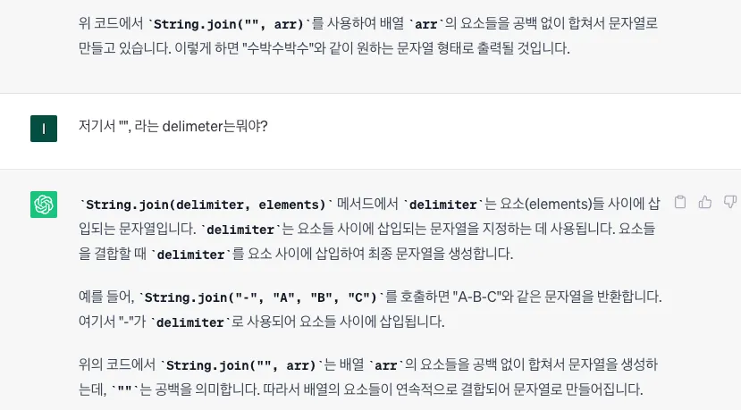 이제 조건까지 수정되고 “수,박,수,박,수”가 출력되었다. 다 된줄 알았지만 문제는 틀렸다. 리턴되어야 할 값은 “수박수박수”와 같은 한개의 문자열이었다. 나는 5개의 문자열을 보내고 있었다. 여기서 요소들을 모두 합쳤어야 됬는데, for문을 통해서 answer += 로 누적하는 방법이 있다. 하지만 조금 다른 방법이 없는지 ChatGPT를 통해 조언을 구했다.