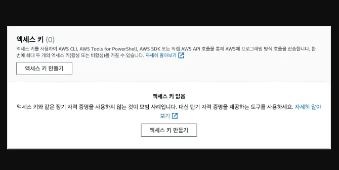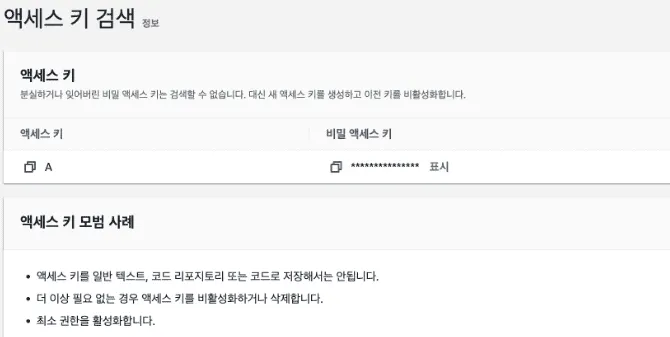 액세스 키를 사용하여 AWS CLI, AWS Tools for PowerShell, AWS SDK 또는 직접 AWS API 호출을 통해 AWS에 프로그래밍 방식 호출을 전송합니다. 한 번에 최대 두 개의 액세스 키(활성 또는 비활성)를 가질 수 있습니다.