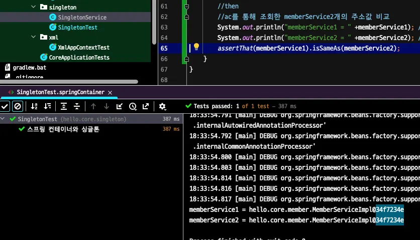 싱글톤과 관련된 코드가 없는 상태에서도 ac.getBean()을 통해서 조회하고 있다. 조회 요청에 응답된 인스턴스의 참조값이 같은 것을 통해서 최초 스프링 컨테이너에 등록된 빈이 싱글톤으로 생성 되었음을 확인 할 수 있다.
